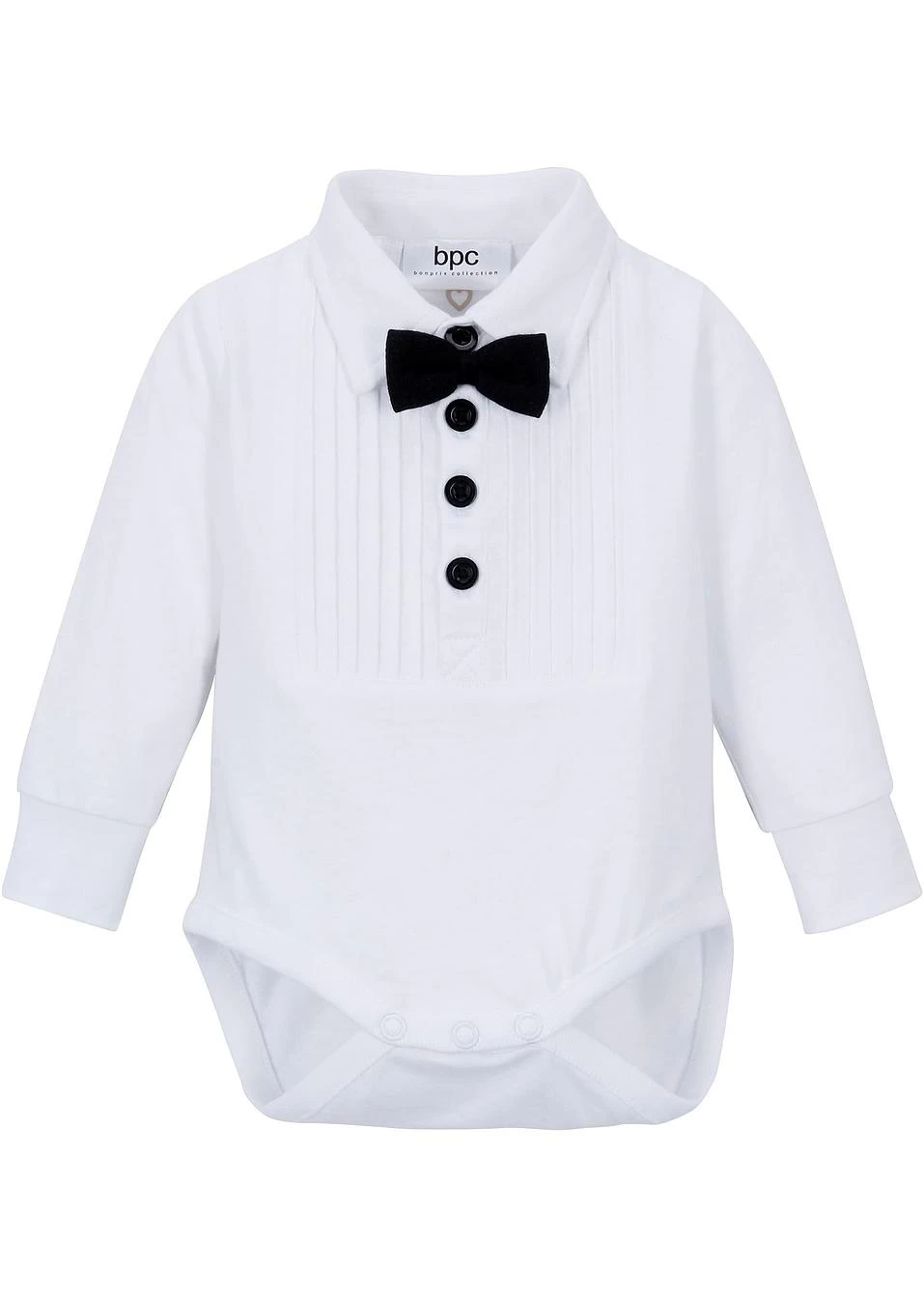 Adorable body bébé à manches longues. Facile à enfiler grâce à une patte de boutonnage devant et des boutons-pression à l’entrejambe. Avec petits boutons et nœud papillon de coloris contrastant, bébé est aussi paré pour les occasions festives.