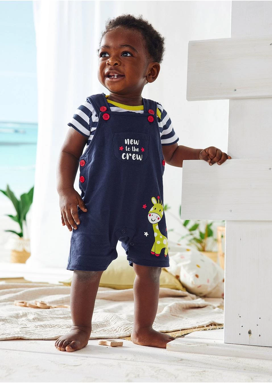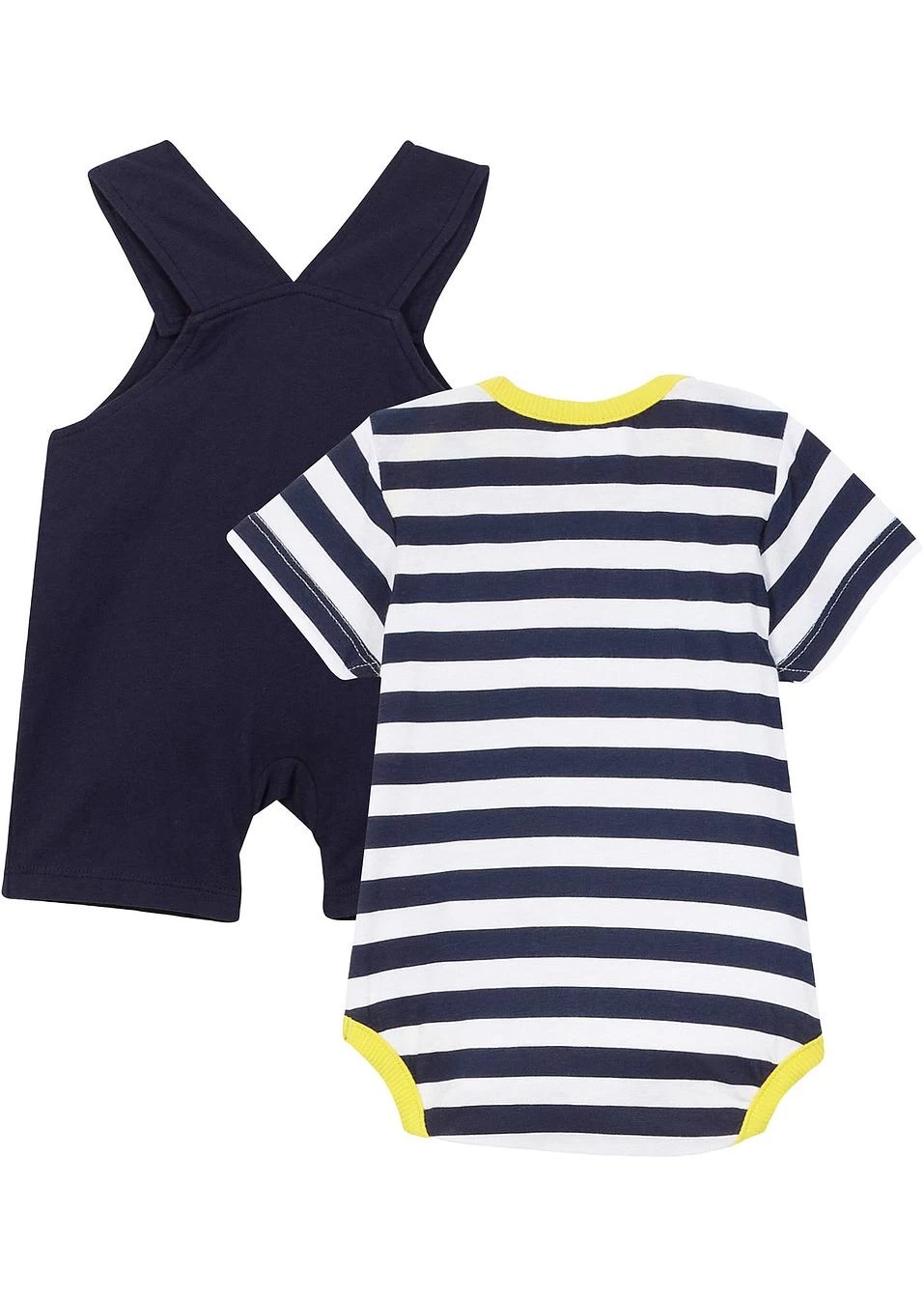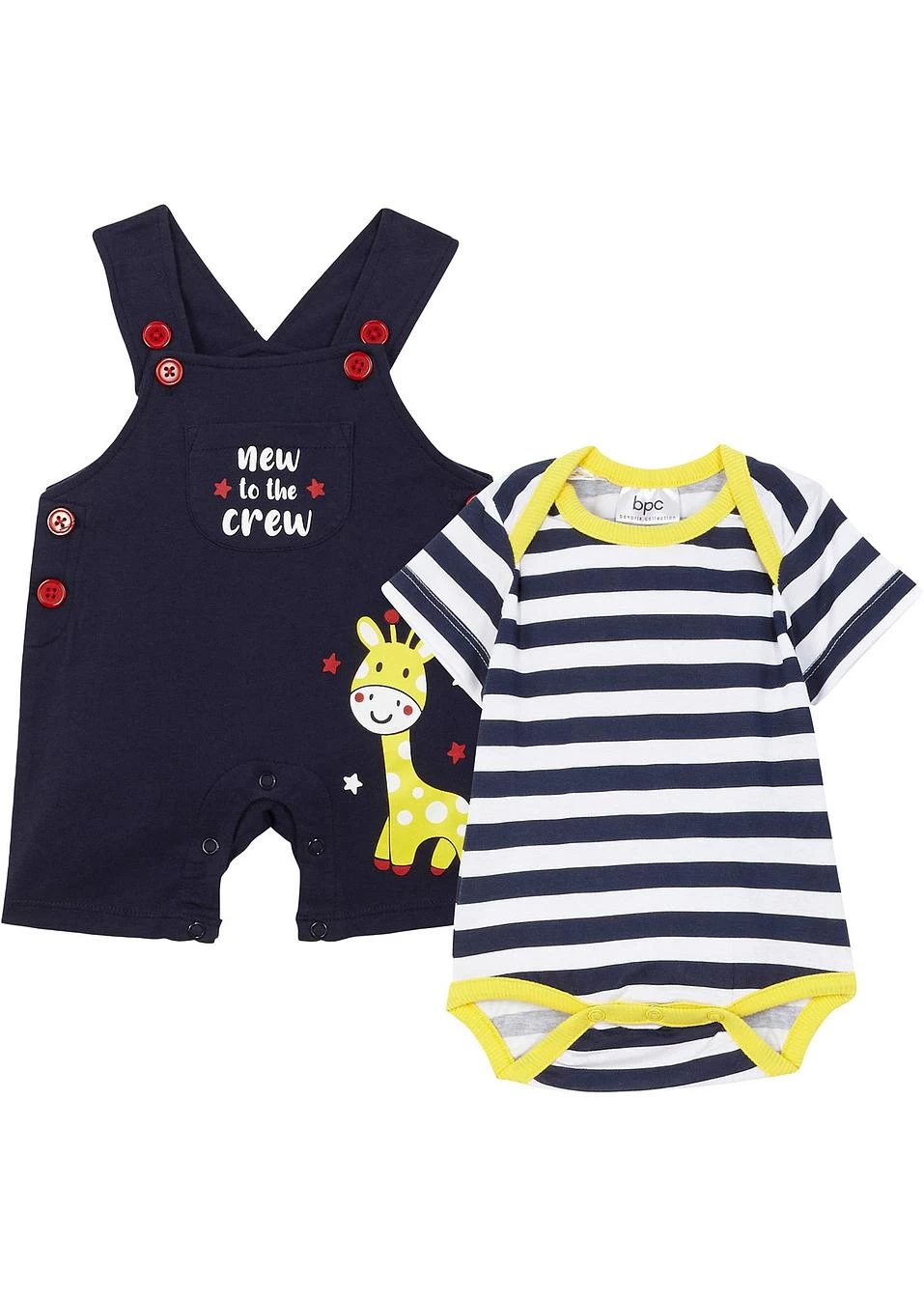 Body et salopette avec un imprimé girafe cool et des détails contrastants. Fermeture pratique par boutons pression sur l’entrejambe du body et de la salopette.