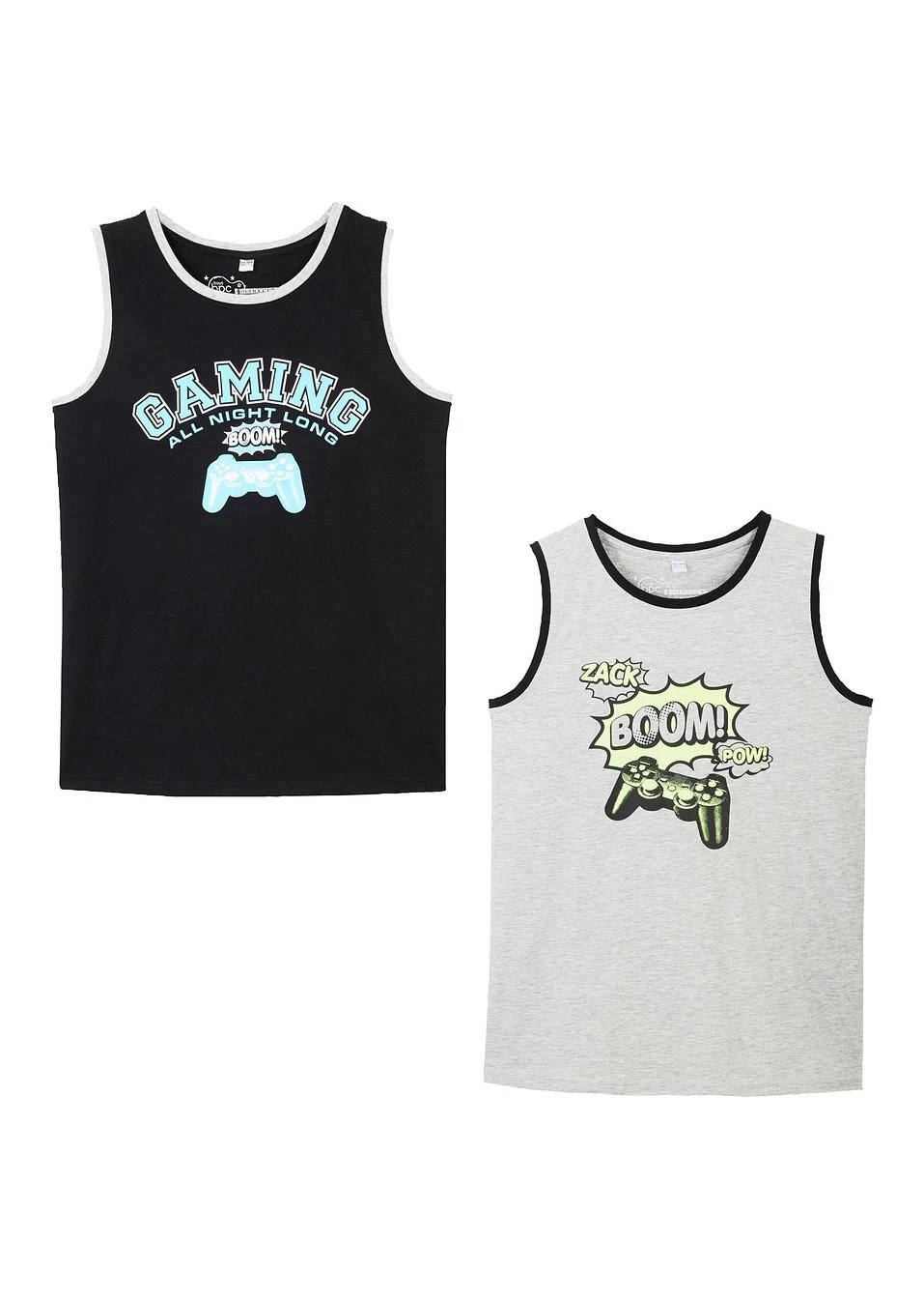 Vivement les prochaines vacances d’été avec ces débardeurs de bpc ! Le lot comprend deux débardeurs avec un imprimé gaming sur le devant. Col rond. Ces modèles se portent avec un short de bain à la plage ou un bermuda à la ville.