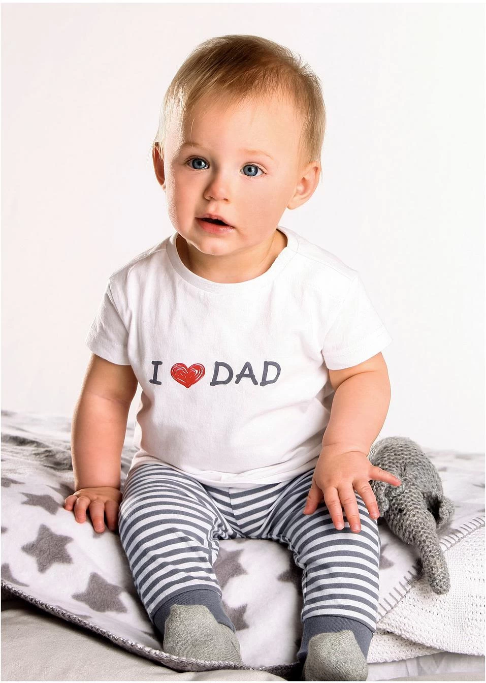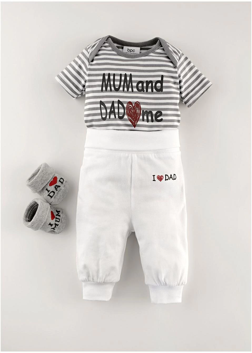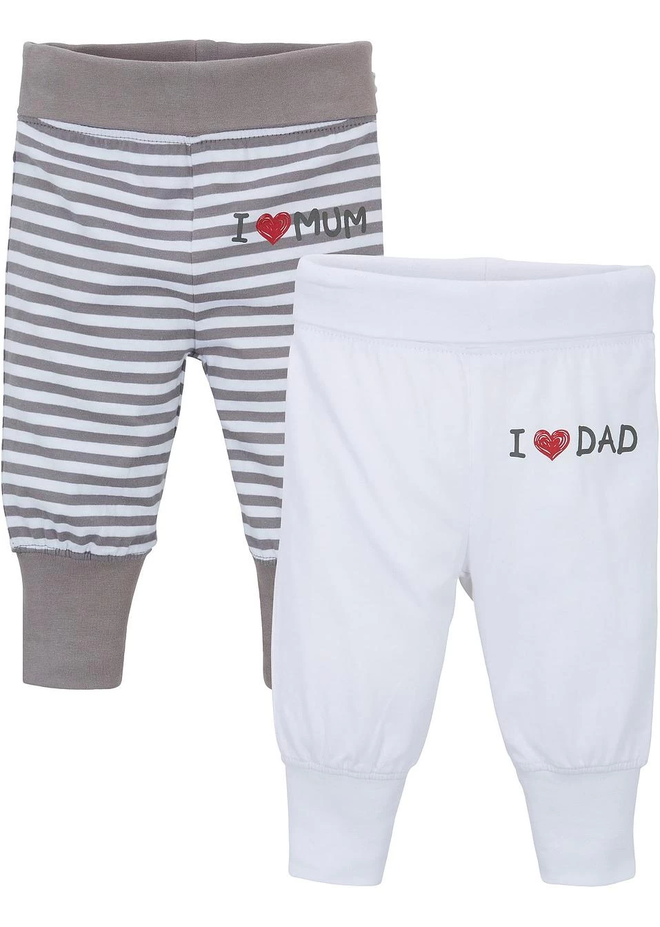 Ce lot pratique de deux pantalons comprend un modèle rayé imprimé « I love MUM » et un modèle uni imprimé « I love DAD ». Coupe confortable avec bordures en bas de jambes et large revers à la taille. Bébé pourra crapahuter à son aise.