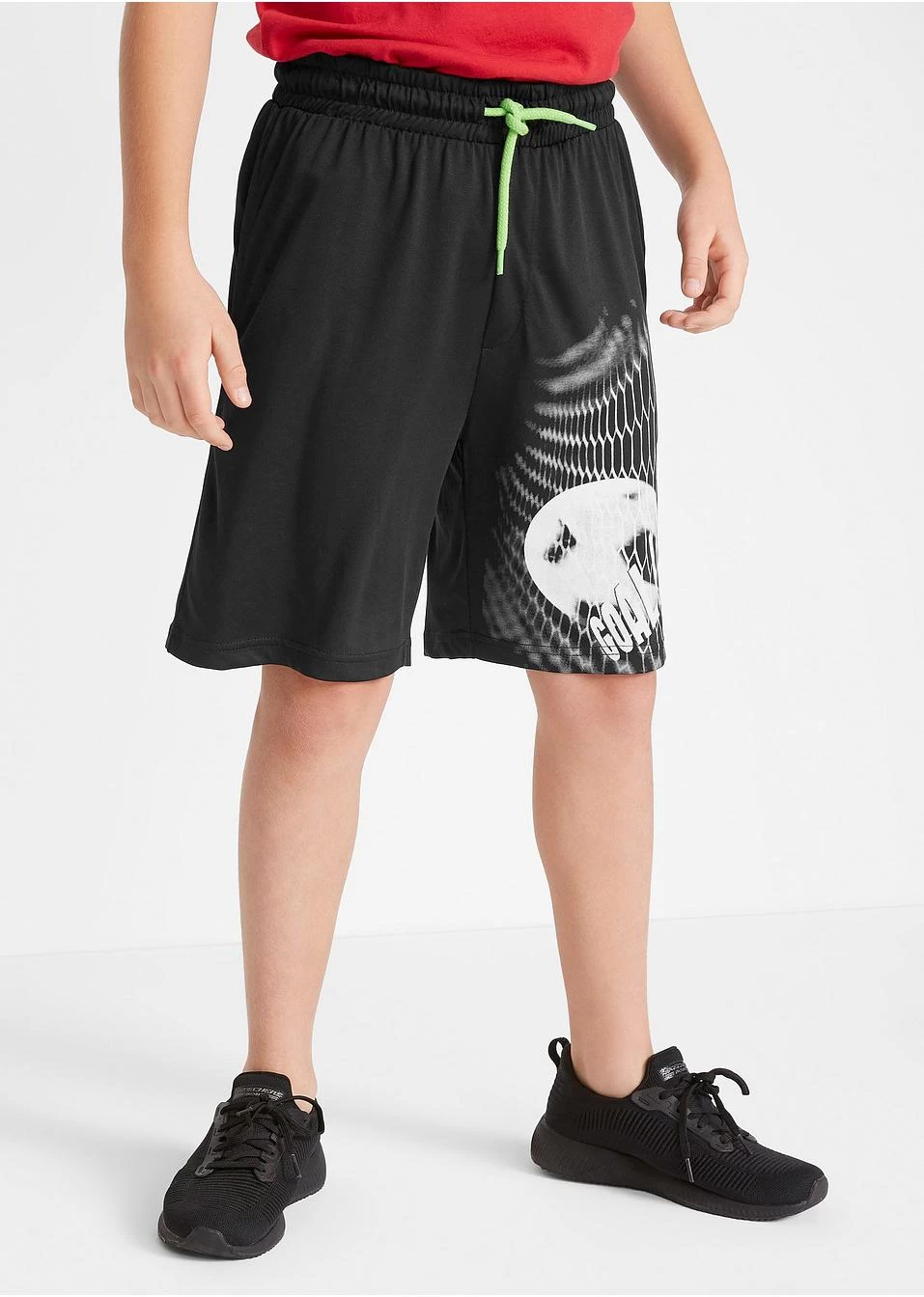Pantacourt de sport avec grand imprimé ballon de foot sur la jambe gauche. Taille extensible avec un cordon de serrage vert fluo.