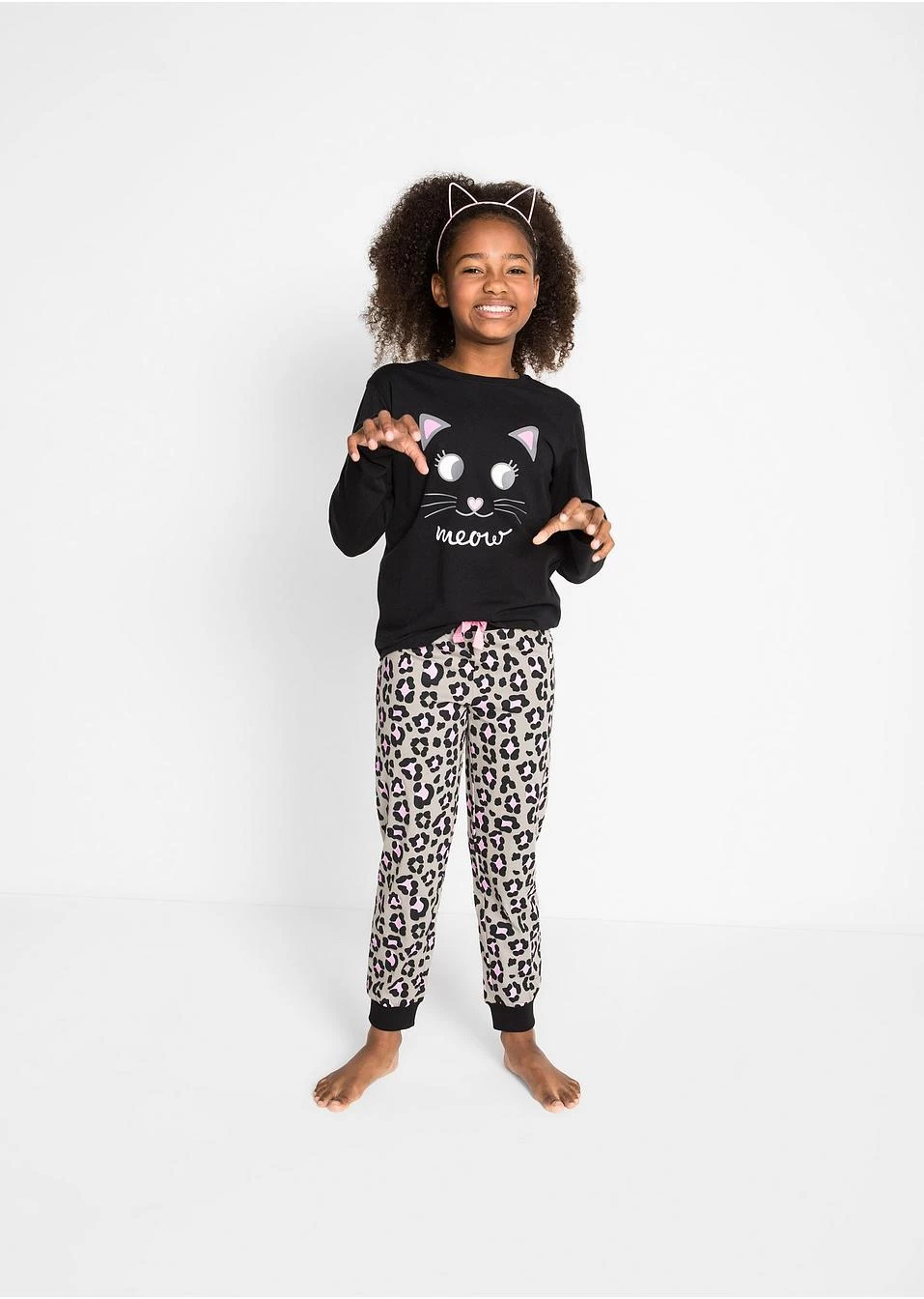 Pyjama 2 pièces. T-shirt à imprimé chat placé sur le devant. Pantalon élastiqué à la taille avec ruban fixe, entièrement imprimé à motif léopard. Finitions élastiques en bas de jambes.