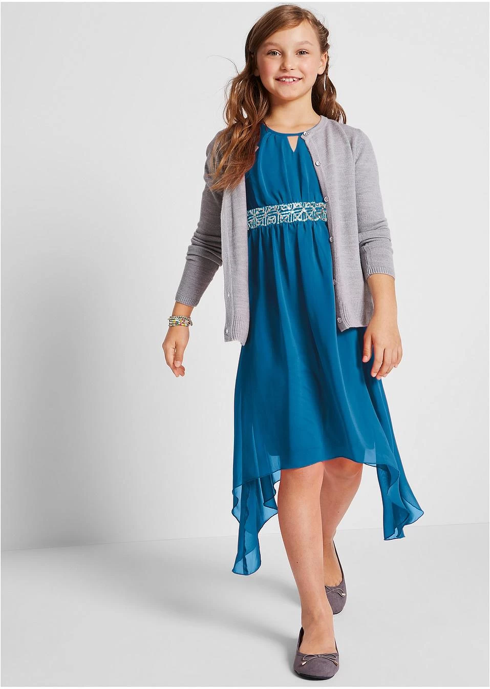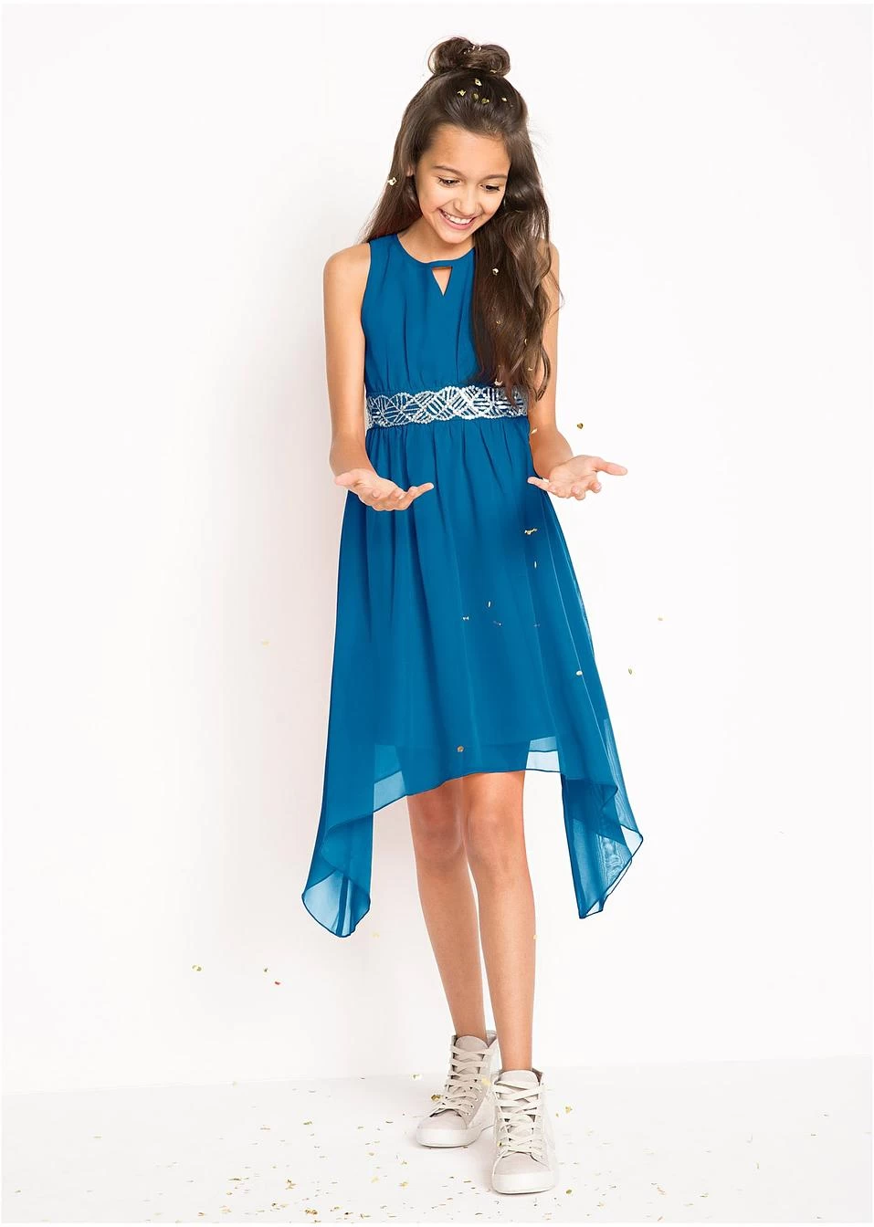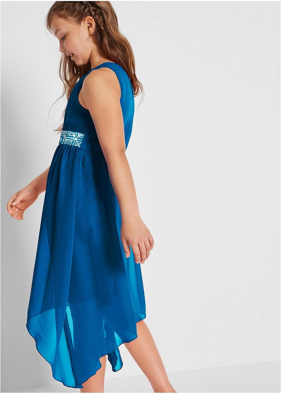 Robe sans manches à col rond avec petite fente en V. L’empiècement élastique à la taille est orné de paillettes sur le devant. Tissu dessus asymétrique et plus long sur le côté.