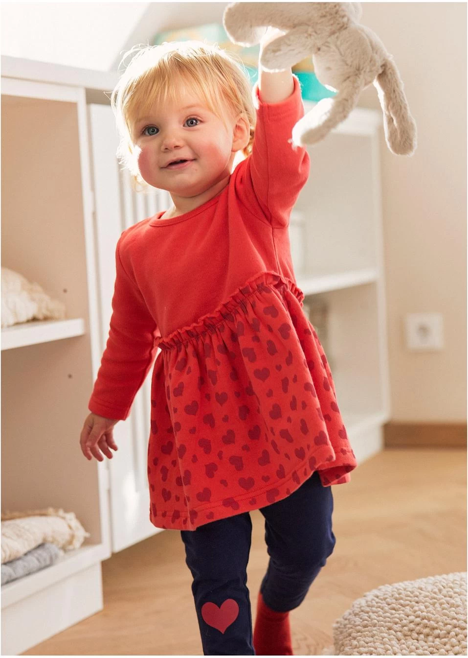 Joli ensemble composé d’une robe à imprimé petits cœurs avec partie jupe évasée et d’un legging assorti. Patte de boutons pression sur l’épaule gauche pour faciliter l’enfilage.
