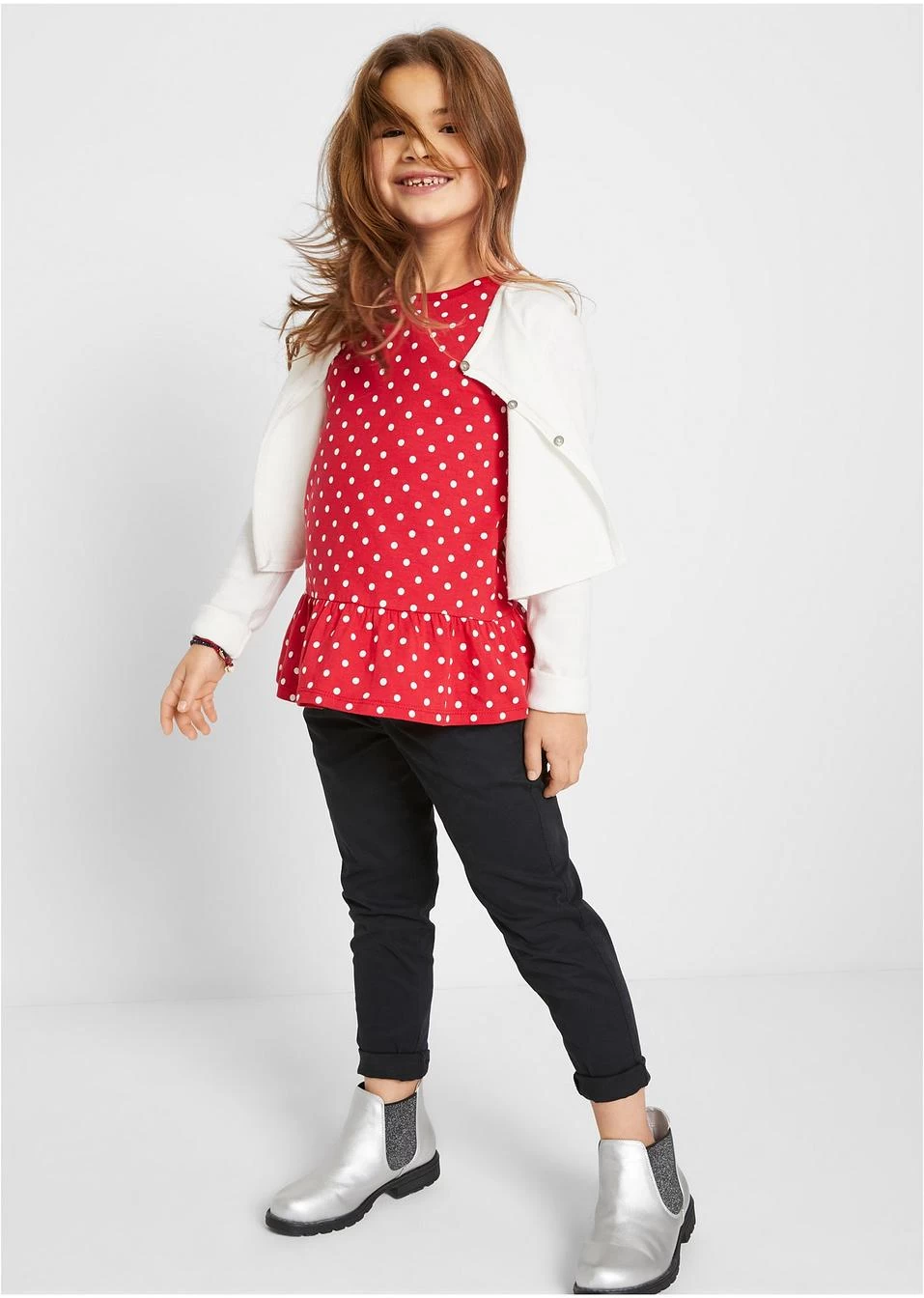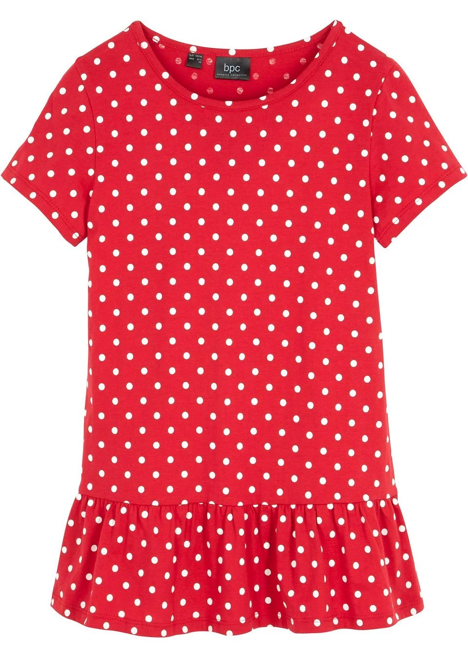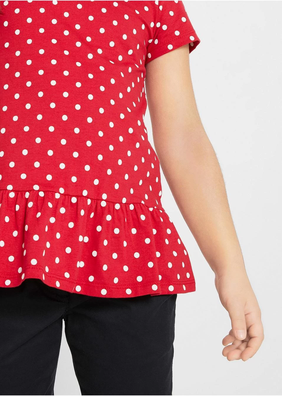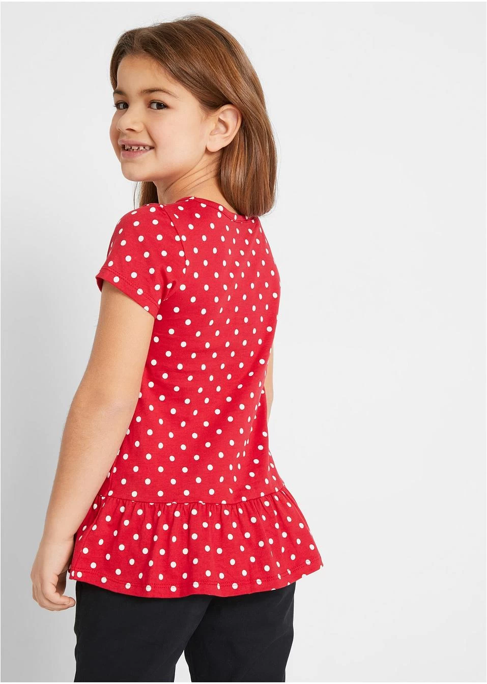 Ce joli T-shirt à volant est très facile à associer. Son coloris rouge à pois est ravissant.